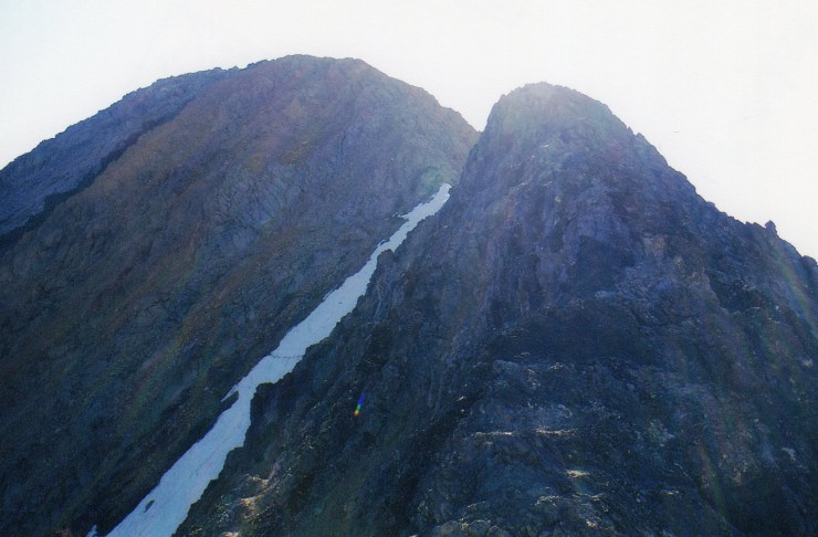 Anyway, the route to Gunsight soon became evident – a wide, sweeping switchback … Class 1 all the way and fairly mellow. Within an hour of leaving my tent, I reached Gunsight Pass and felt good. In spite of my plans not to take any shortcuts, I soon spied one that way too good to pass up as I descended toward Painter Basin. The trail essentially split … straight ahead was the “long way,” but to the right, the path paralleled the well-known yellow cliff band just below any kind of awkward scree traverse. I quickly zoomed by a pair of climbers that had taken a higher line and were making slow work of the blocky scree field. Toward the end of the shortcut, I had to make my way across a couple of minor snowfields before ascending back up to the main trail.