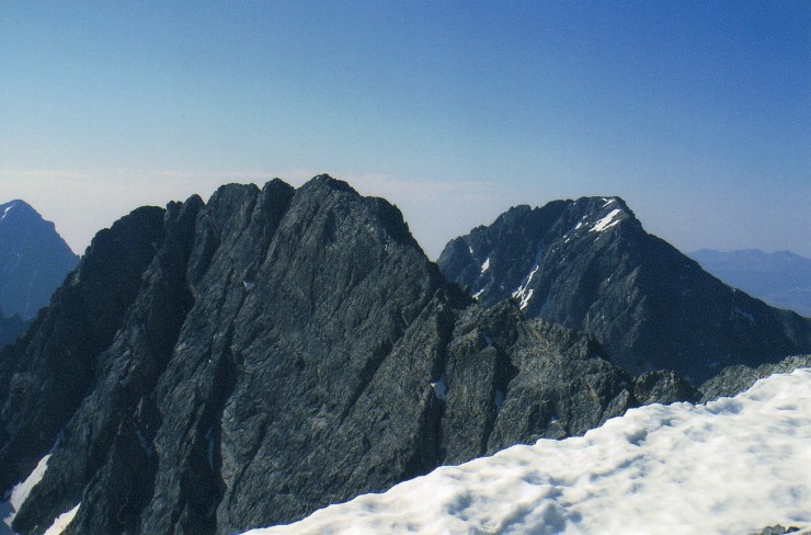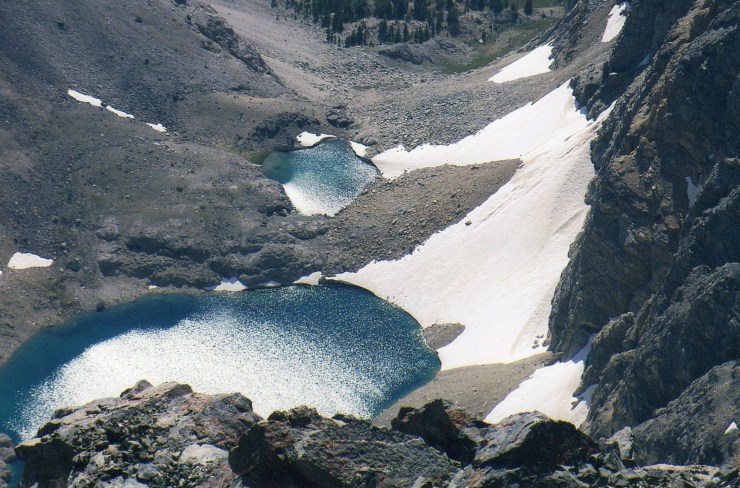 I enjoyed every minute of the hike as I closed in on Chicken-Out-Ridge. Now that I was in motion, my self-doubts melted away. “Stay high on the ridge … right over the top.” That’s what I’d read. “The handholds are good and the rock is solid.” Just before reaching C.O.R., I caught up to a couple from Idaho probably in their late 20s or early 30s. I took an instant liking to them and we talked a bit. I soon learned that the gentleman had previously climbed Borah and he helped kill any remaining doubts I had about Chicken-Out-Ridge. Before long, we were all scrambling over the Class 3 terrain closing in on the snowfield at the end of the ridge. The crossing of the snowfield proved easy as solid steps had been kicked in by this season’s climbers.