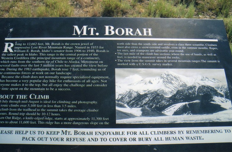 On the morning of July 24th, I found myself in Blackfoot, Idaho on the edge of the Fort Hall Indian Reservation. The plan for this day was to simply work my way north to Mount Borah, find the trailhead and get in a short acclimatization hike on her lower slopes. The trailhead proved quite easy to find with a well-marked gravel road leading four miles from Route 93. I hiked in and upwards for less than a mile (gaining about 800 feet) and left feeling pretty good about my chances of summiting the next day. Chicken-Out-Ridge, however, loomed large in my mind the rest of the day as I tried to keep my self doubts in check. I’ve never been shy about turning around on a mountain when things don’t feel right, but I really didn’t want to “chicken out” in good weather while feeling physically fine. In short, I didn’t want to lose a mental battle with this peak.