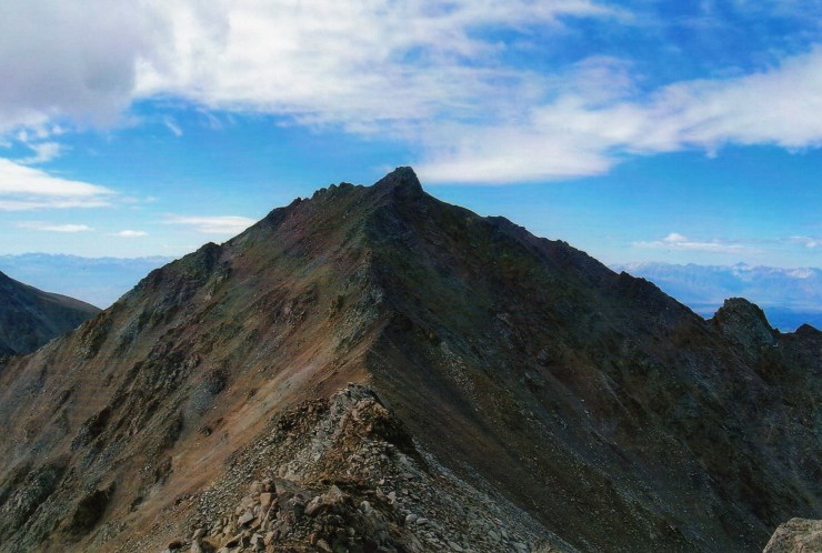 As I approached the Humphreys/Agassiz saddle, however, the wind started to pick up and by the time I hit the ridge, it was blowing full force. I’m not great at estimating these things, but I’d guess it was at least in the 40-50 MPH range. In any event, the wind was strong enough to turn around the gentleman that I’d seen start on the trail before me. I continued along an awesome ridge hike that steadily gained elevation as I fought off the wind. At times, the ridge itself blocked me from the worst of the wind while at other times, I was exposed to its full blast. Overall, the footing on the trail was good and the wind was manageable as I worked my way over a series of humps. The only real concern I had was that I was occasionally getting pelted in the face by small, loose stones picked up by the strong gusts (Note to self: Keep glasses on. It’s all fun and games until someone loses an eye.)