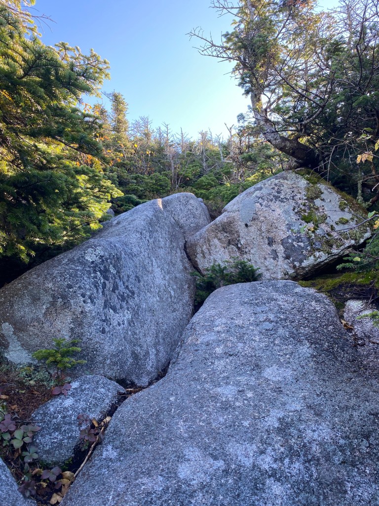 Up and out in the dark once again. For the second morning in a row, I broke down my campsite in the glow of my flashlight and lantern. This time not because I had a big hiking agenda but rather because the gate to Baxter State Park opens at 6 AM and I knew the cars would be lining up early on what was forecast to be a beautiful mid-September Sunday. I rolled up and took my place in line at 5:15 AM with about 20 cars waiting in front of me. Not bad. I figured I would be processed through within 30-45 minutes of the gate opening but it turned out to be quicker than that as many of the cars in front of me were sent to the waiting lane. They had come to hike Katahdin, no doubt, and did not have the requisite parking reservations so were sent to the side. No such problem for me. Doubletop is an outstanding and well-known feature within BSP but quite simply is not on much of anyone’s radar to climb. After getting through the gate and driving 10 miles on the park’s dirt tote road, I arrived at the trailhead just after 7 AM. Perfect. The agenda for the day was to complete the 9 mile round trip hike to the spectacular summit of Doubletop and then start the long drive home. I would have the mountain completely to myself for most of the morning. I crossed paths with one trail runner early on but then didn’t see anyone else until I was well into my descent. Doubletop by either the approach from the south or the north is difficult in spots because of its pyramidical peak that becomes quite steep – as in handholds required – in its upper reaches. I chose the southern approach mostly because although the round trip hiking mileage is a little longer, it is seven miles closer to the park entrance. I reasoned that I would rather spend extra time on the trail than in the car. I would not be disappointed with my decision. The first section of the trail is quite flat with an approach hike of about 1.5 miles that affords some spectacular glimpses of the mountain you are about to climb. I found myself staring at the impressive summit cone of Doubletop wondering just what exact route the trail would follow to get to the summit. Ultimately, I decided it would have to cut back across the southern face in an east to west fashion before ascending from a saddle on the west side of the peak. Any other way would simply be too steep for this to fall into the category of a “hike.” And this, in fact, is just what the trail did.