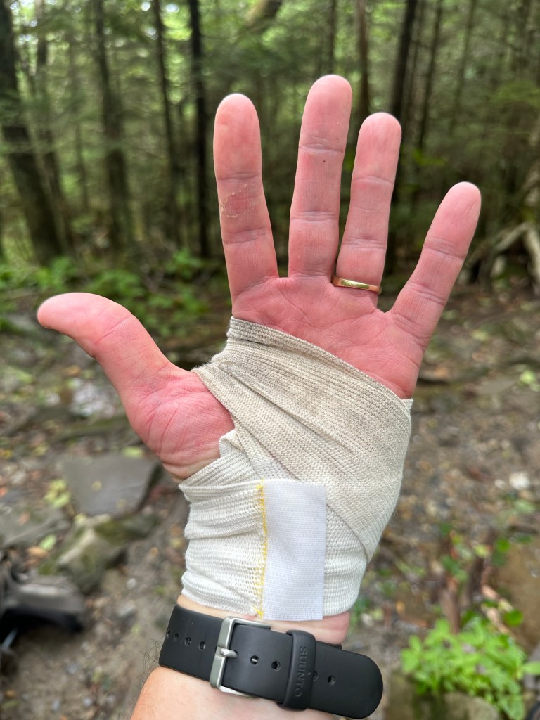 After about 90 minutes of hiking, I slipped on a wet rock that also happened to have sharp edges. As I plunged face-first downwards, I instinctively put my left hand out, thus preventing me from what would have been a pretty nasty injury to the face.