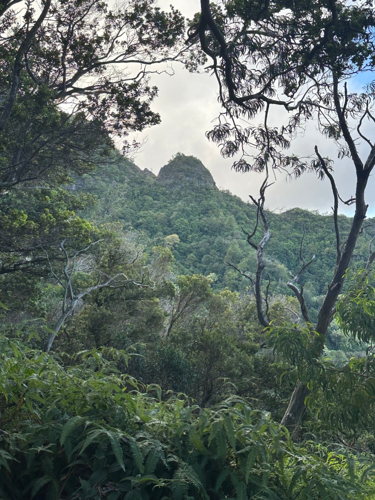 But I could hear them behind me and so when I stopped for a break at the bottom of the ridge proper, they caught up to me and we chatted for a few minutes. They were all currently living in Hawaii but had come from all over the US. Maryland, Utah, California and Arizona, if I remember correctly. They had suggestions for other cool hikes on the island and I listened with interest even though I knew our time left in Hawaii was short. And then they were gone.