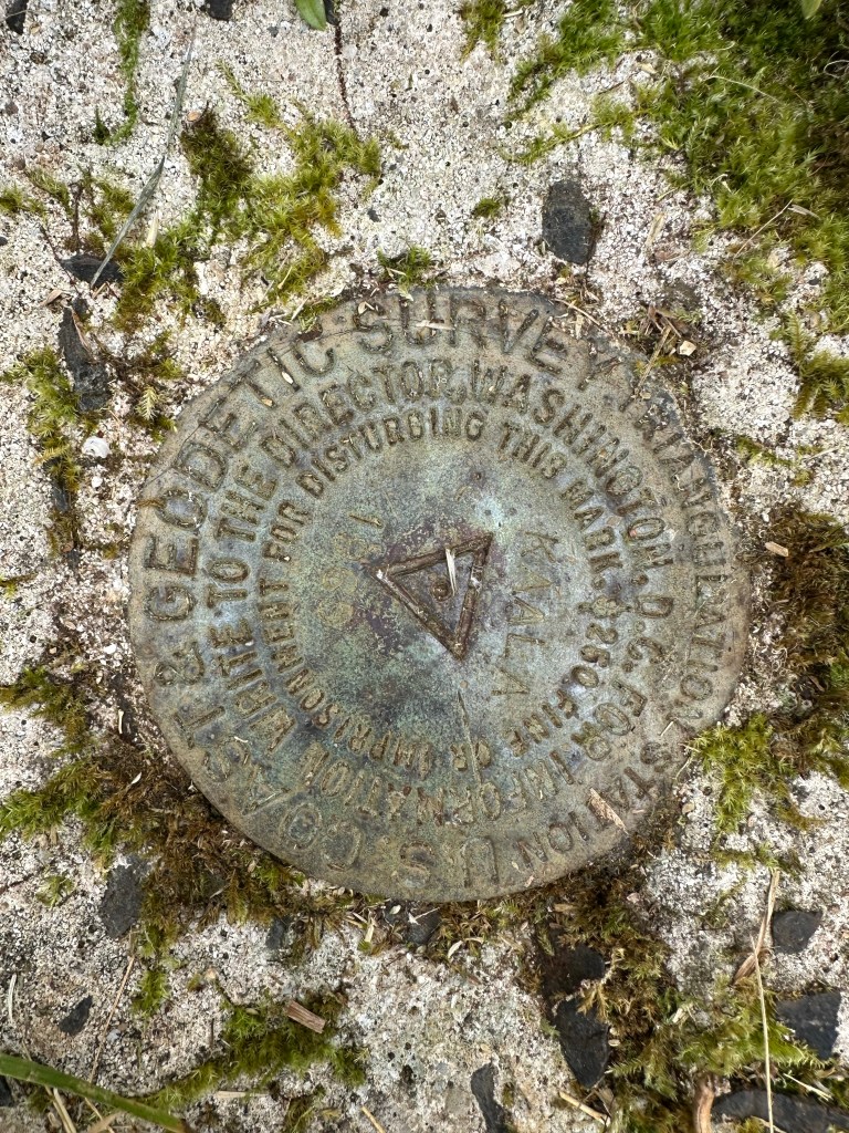 We all crossed the restricted road together and went off searching, soon locating a gate that led around the fence before we parted ways again. They continued all the way around the fence while I searched one specific area for the USGS marker. Bingo.