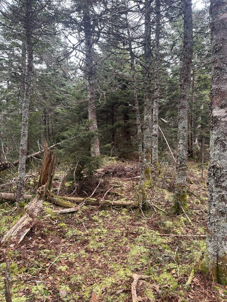 The woods were both thick and pathless so the going was slow. I set a compass bearing in a southwesterly direction and repeatedly checked on it to be sure that I was heading the right way. The ridge is narrow with steep drop-offs on both sides so, from that perspective, it was not difficult to keep myself on the correct route.
