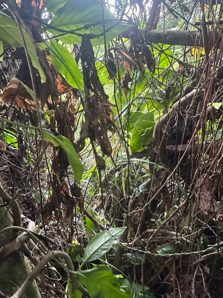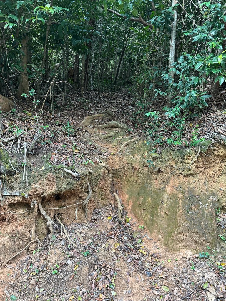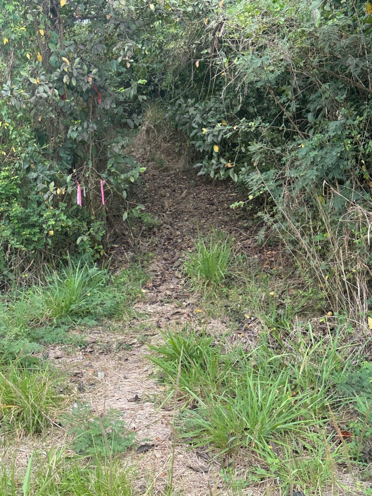 I spied a possibility and returned to my rental car to change out of my new sneakers in favor of a pair of throw-aways I’d brought for my hikes. Here goes nothing! As soon as I stepped into the dense vegetation on the far right, the ground dropped several feet and I found my suspect. I’m not sure I would call it a hole in the fence as much as going underneath it. But the vegetation in this area was so thick that I had to throw all of my weight into it to create an opening large enough for me to fit through. Also, a single strand of barbed wire sneakily blended in. I took four or five small cuts in the ordeal that lasted no more than two minutes. But soon enough, I was through!