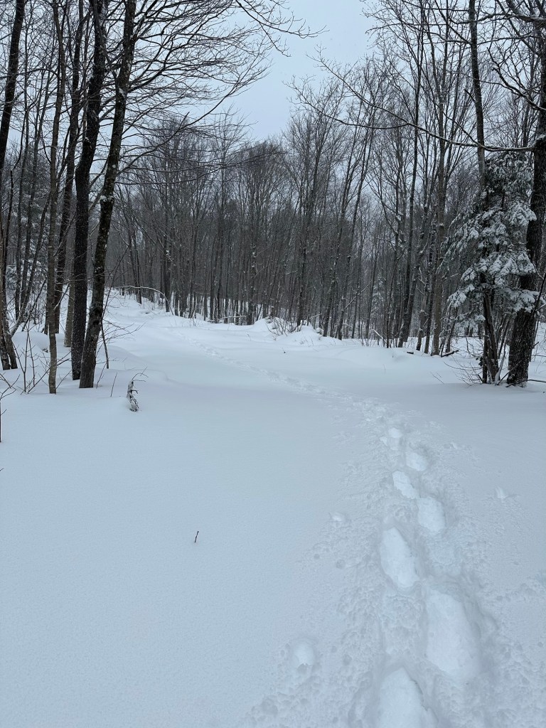 Full of morning energy, I happily bounded down the road at first, getting a feel for the snow conditions. Oof. A layer of several inches of fresh powder lay atop a thin crust with thicker, older snow lying underneath. This had in part been caused by the previous day’s rain and warmer temperatures followed by the overnight hard freeze and snow. It felt awkward as my snowshoes sank through the new fluff and then continuously broke through the crust at strange angles, both slowing my progress and methodically sapping my energy.