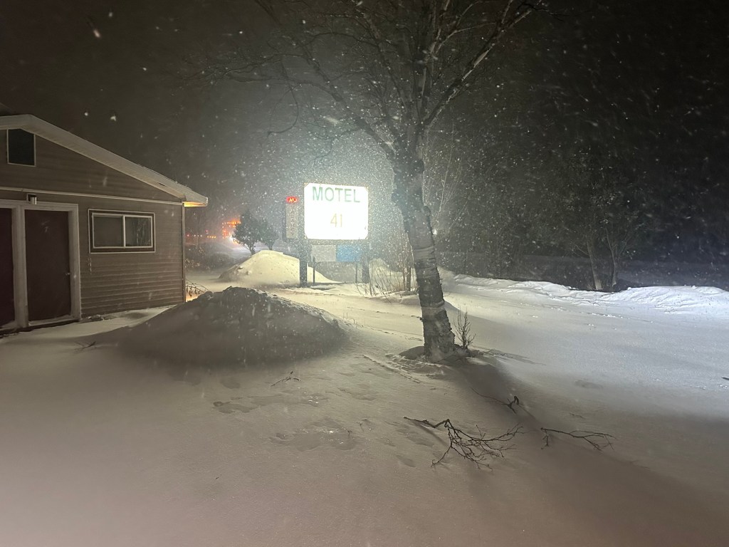 Bone-chilling cold and snow moved in overnight and I had to clear several inches of powder off my rental car before heading to the Burger King in town for my breakfast of champions. I was back at the Motel 41 by 7:30 AM with still an hour to go before sunrise. Although far west of my home in New York, all but four counties on the Upper Peninsula remain in the Eastern time zone, meaning that the sun rises and sets far later than in New York’s Capital District.